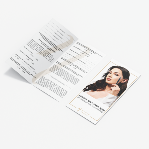 Ankieta do zabiegu przedłużania rzęs wydrukowana na wysokiej jakości papierze połyskującym.