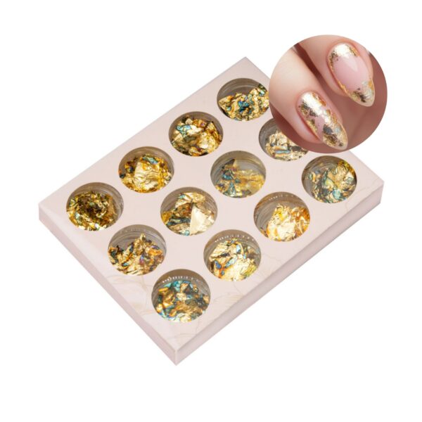W naszym zestawie otrzymujesz aż 12 intensywnych odcieni folii chrom w płatkach – od klasycznego złota i srebra, po modne odcienie miedzi i różowego złota. Całość zapakowana jest w poręczny organizer, gwarantujący idealny porządek.
